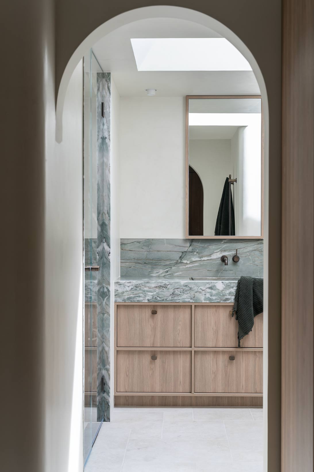 In the ensuite, the curved shower with a built-in bench, a striking Tiffany Quartzite vanity, and a Velux skylight create a refined yet inviting atmosphere. Every detail, from concealed Zetr powerpoints to the recessed exhaust fan, was designed to maintain a clean, streamlined aesthetic.