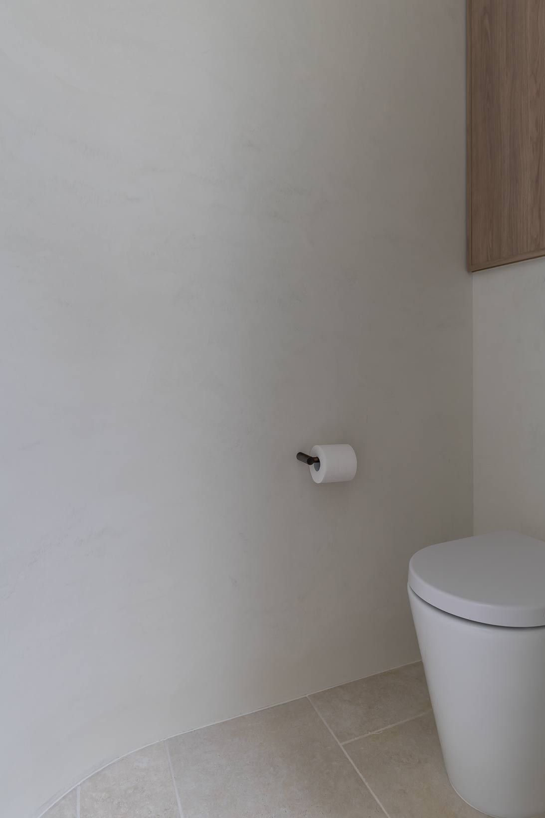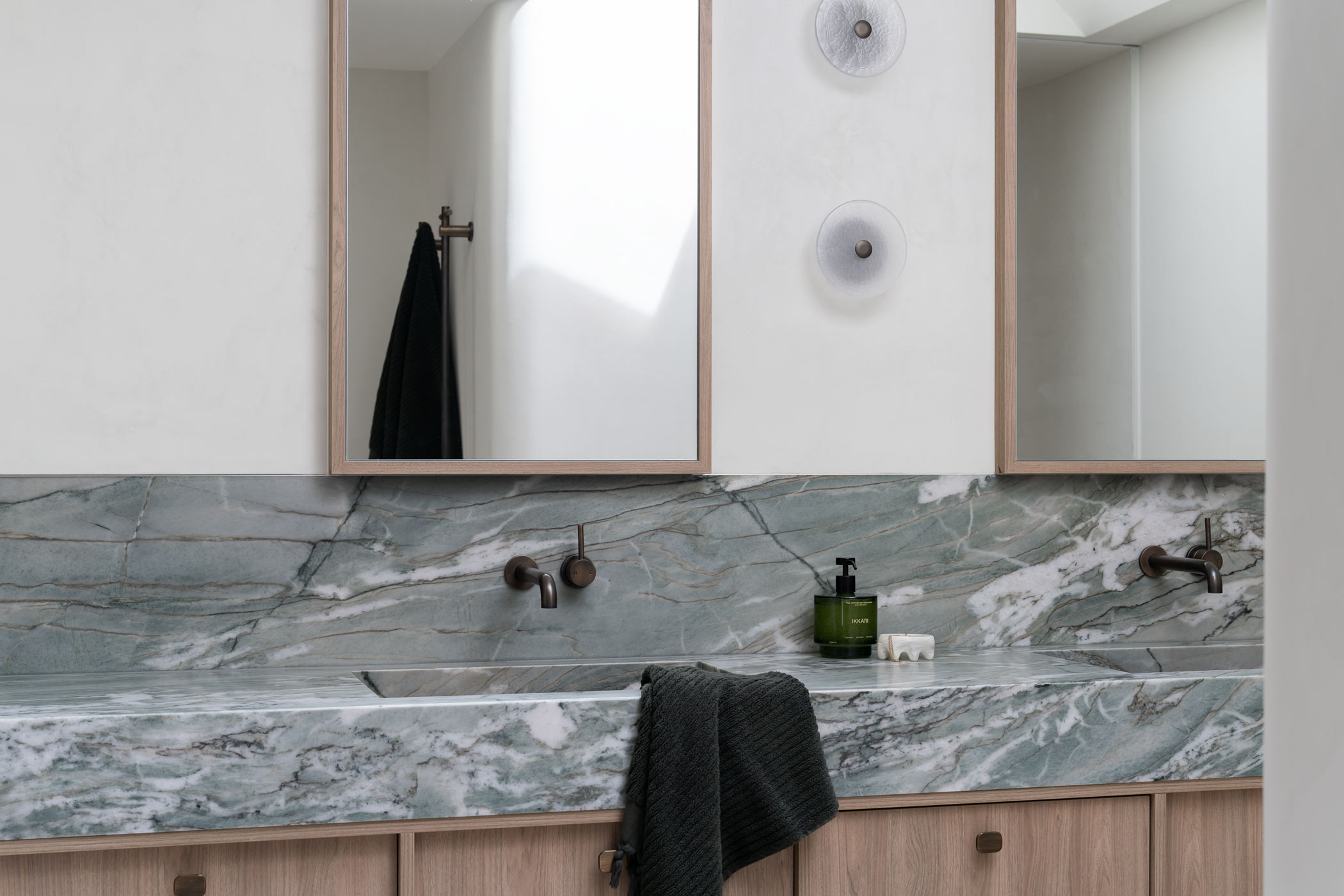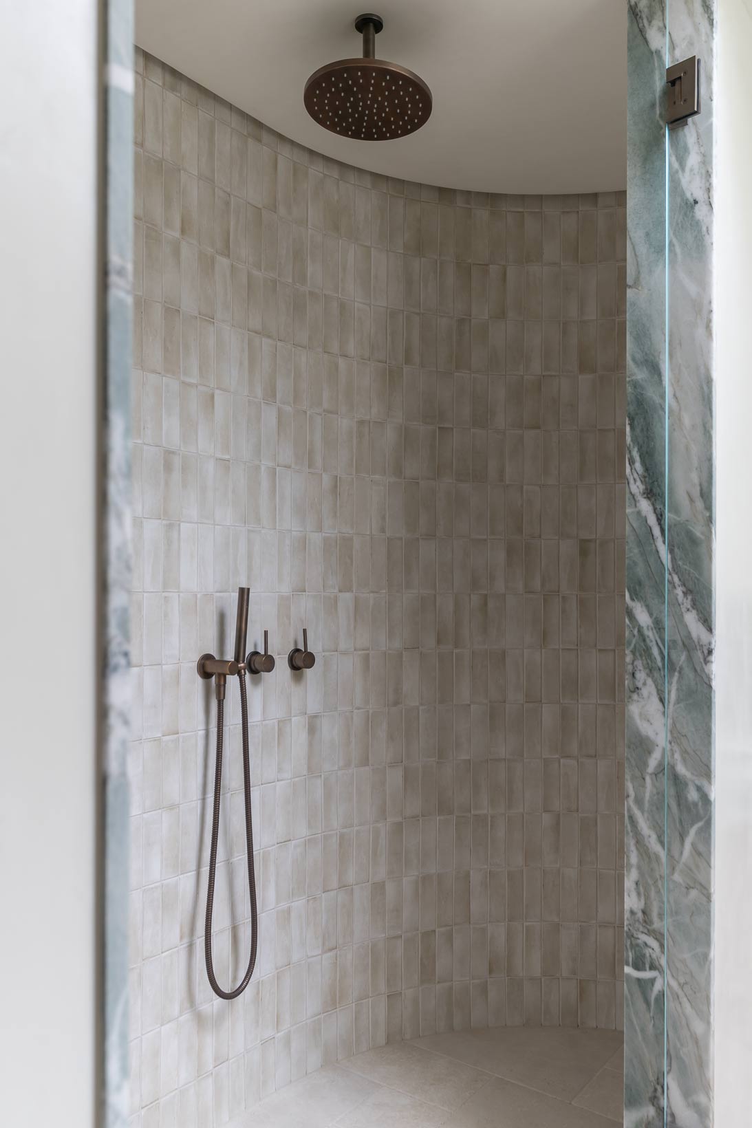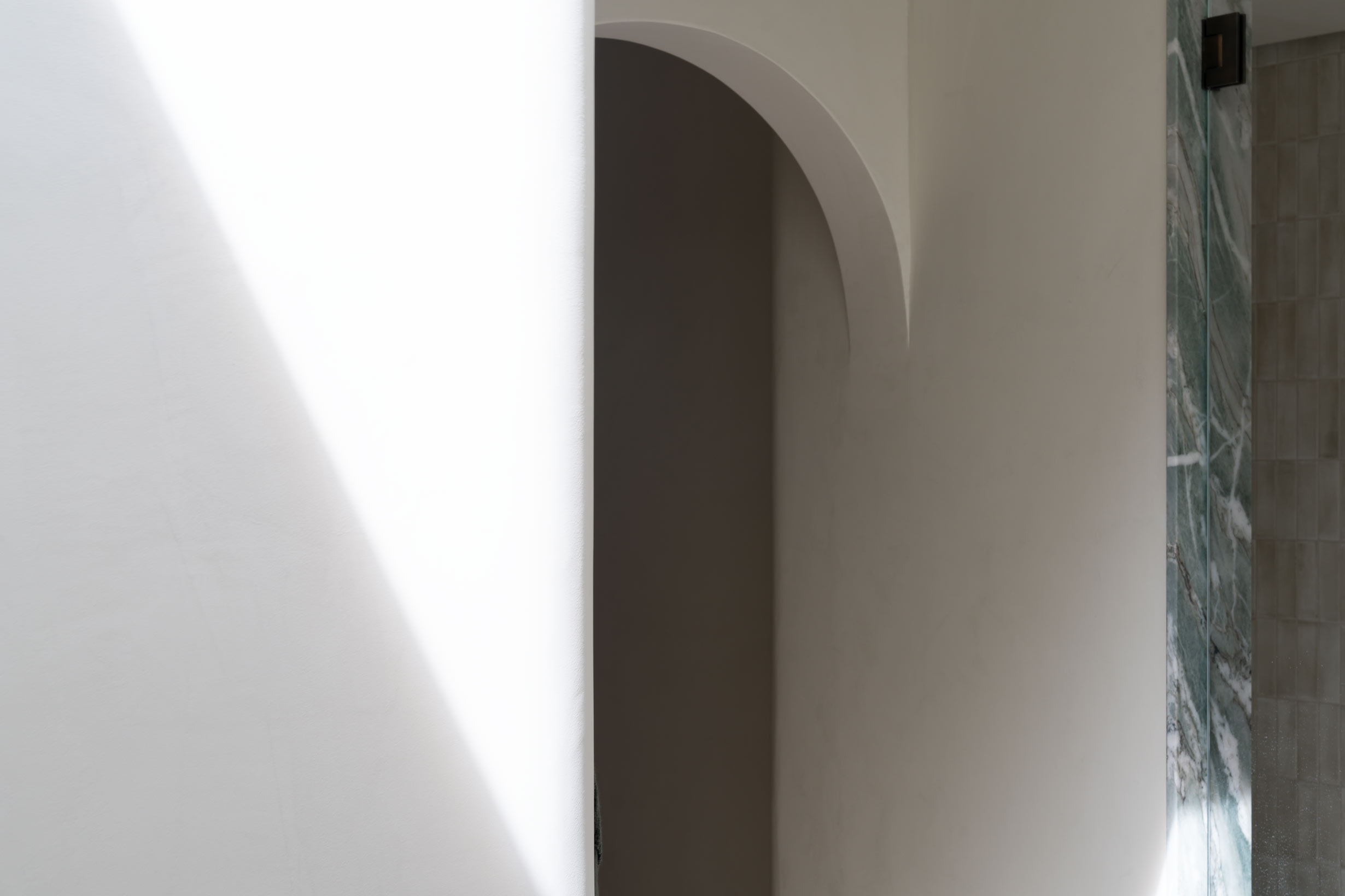 The ensuite balances minimalism with opulence, using Venetian plaster, natural stone, and French lay tiles to create a timeless yet contemporary feel. Integrated lighting, both functional and atmospheric, adds to the luxurious experience, making the entire suite feel effortlessly refined.