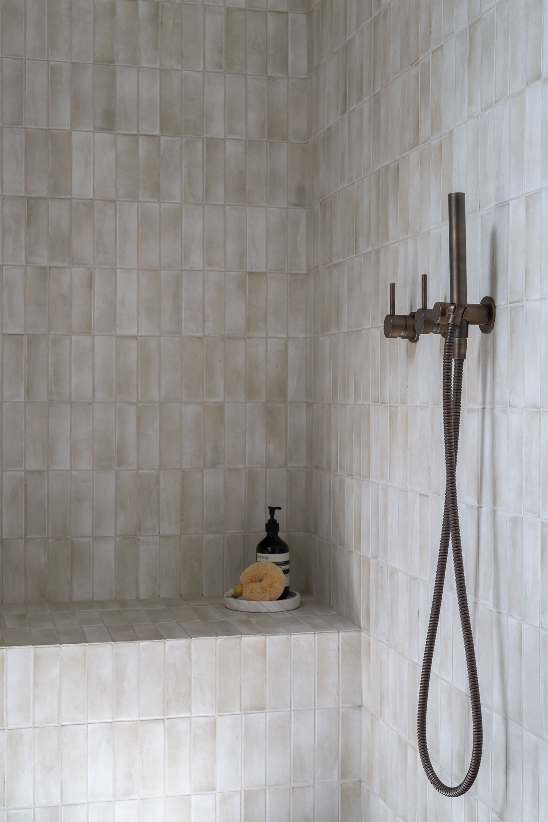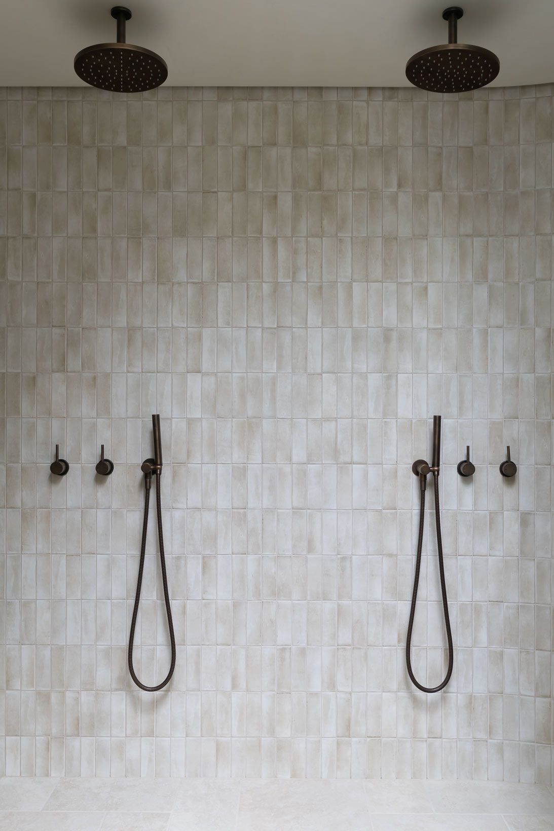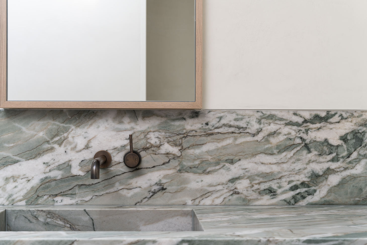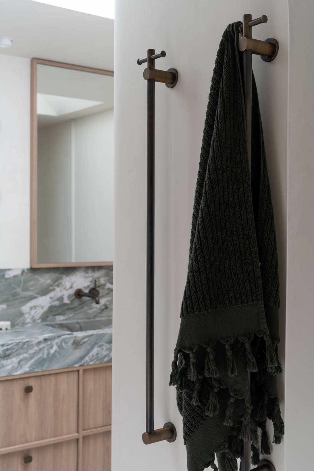 The ensuite balances minimalism with opulence, using Venetian plaster, natural stone, and French lay tiles to create a timeless yet contemporary feel. Integrated lighting, both functional and atmospheric, adds to the luxurious experience, making the entire suite feel effortlessly refined.