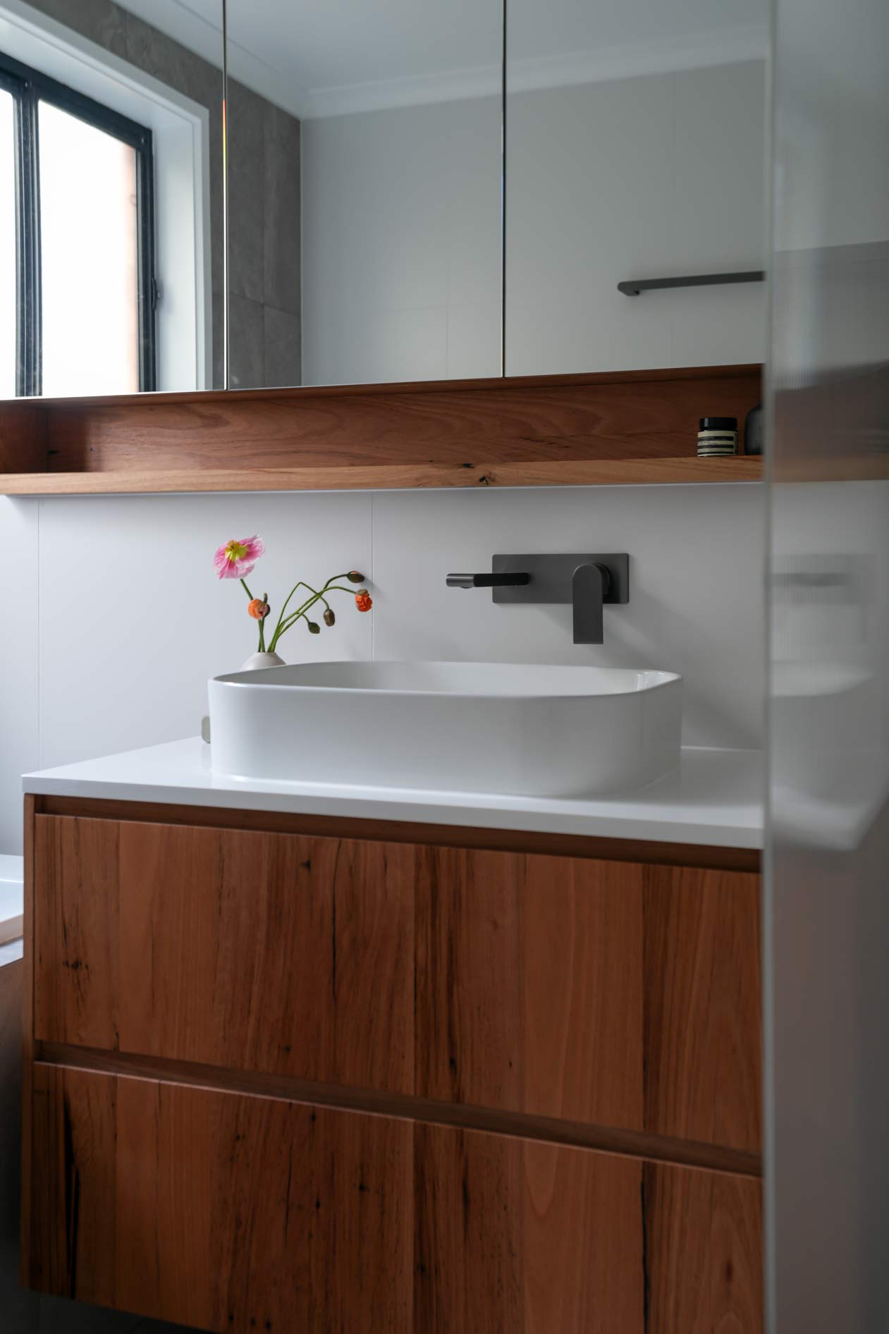 The renovation features custom solid timber vanities crafted to fit the space perfectly, paired with shaver cabinets and additional shelving for practical storage.