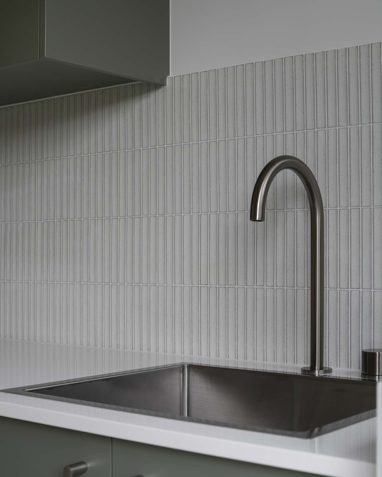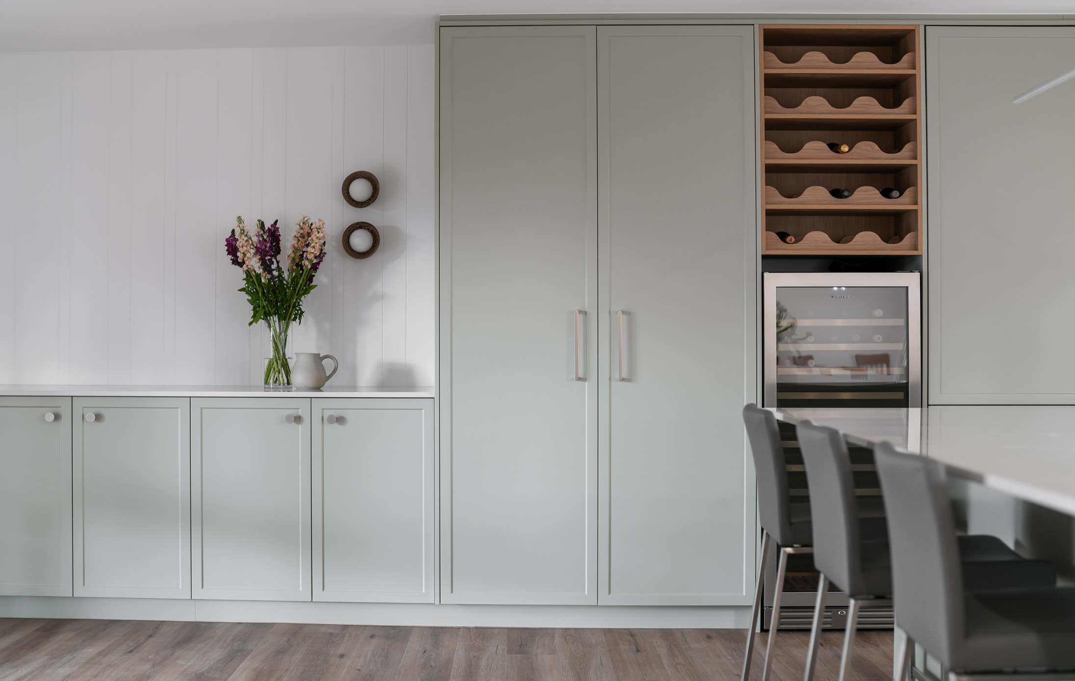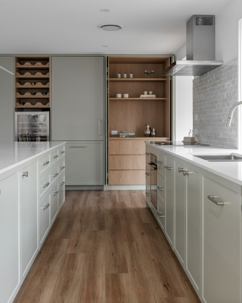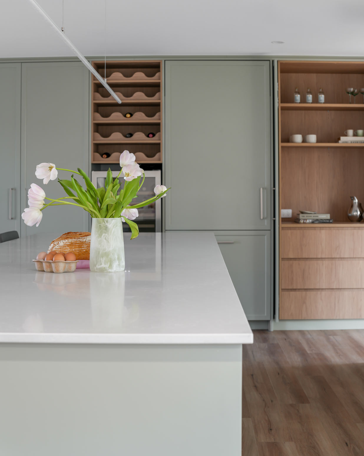 This renovation included a handmade tile splashback that introduced warmth and texture, alongside custom joinery by Made Joinery, which featured timber accents in the wine rack to complement the overall aesthetic.