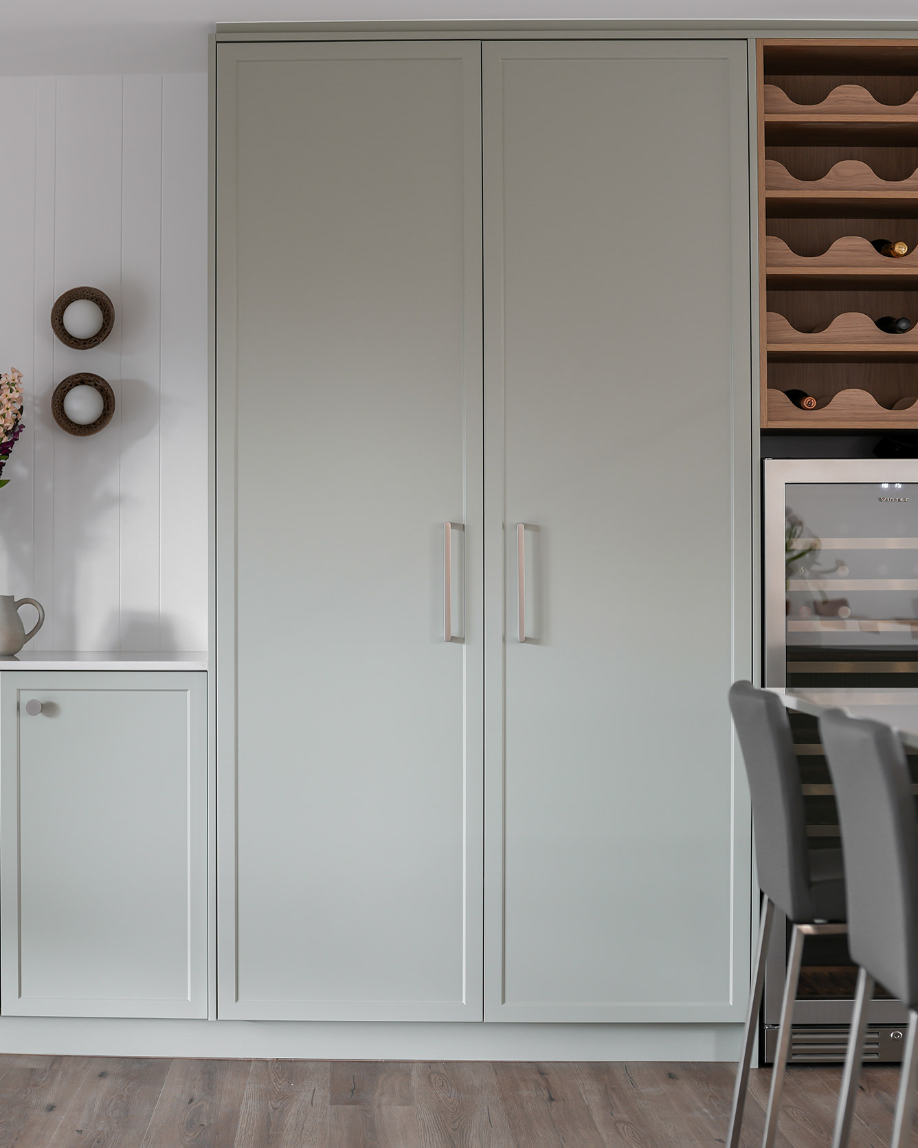 The kitchen was reoriented to accommodate a large island bench, offering ample prep space and seating for guests, while a custom wine rack and Vintec wine fridge catered to the clients’ love of entertaining.