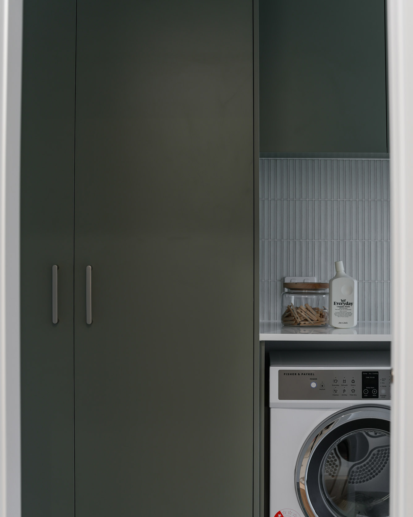 The laundry pairs soft, muted tones with sleek design elements, creating a calming, contemporary retreat.