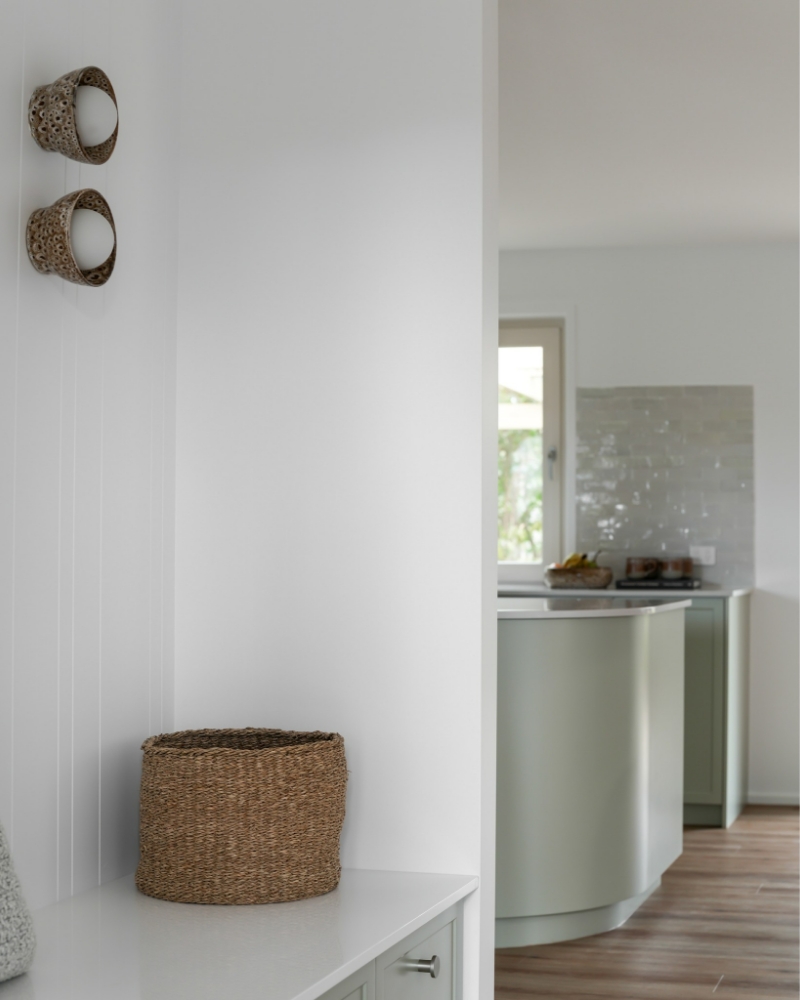 This renovation blends Hamptons elegance with modern elements, paying homage to the home’s mid-century heritage. The colour palette was inspired by nature, featuring shades of green and hints of ochre for warmth and depth. The kitchen cabinetry, finished in Dulux Still, pairs seamlessly with brushed nickel and stainless steel accents, maintaining a refined yet inviting atmosphere.