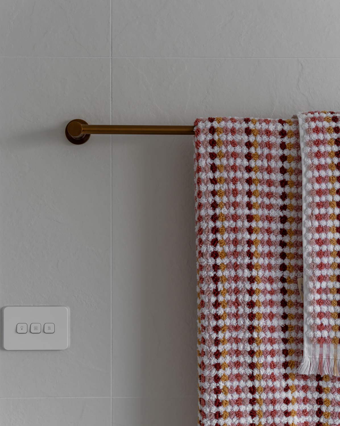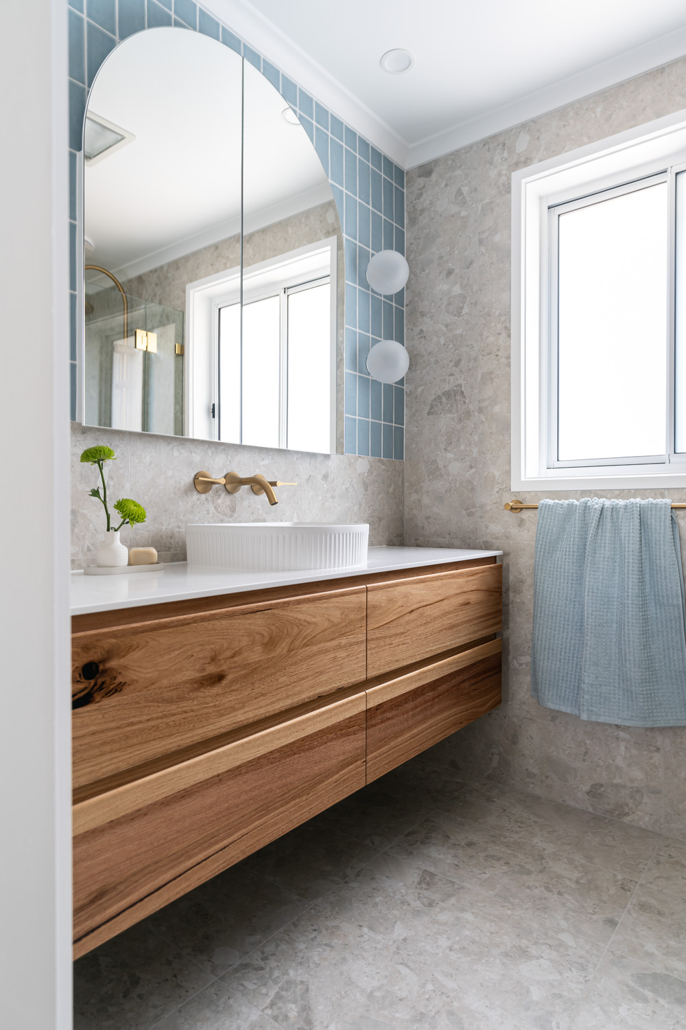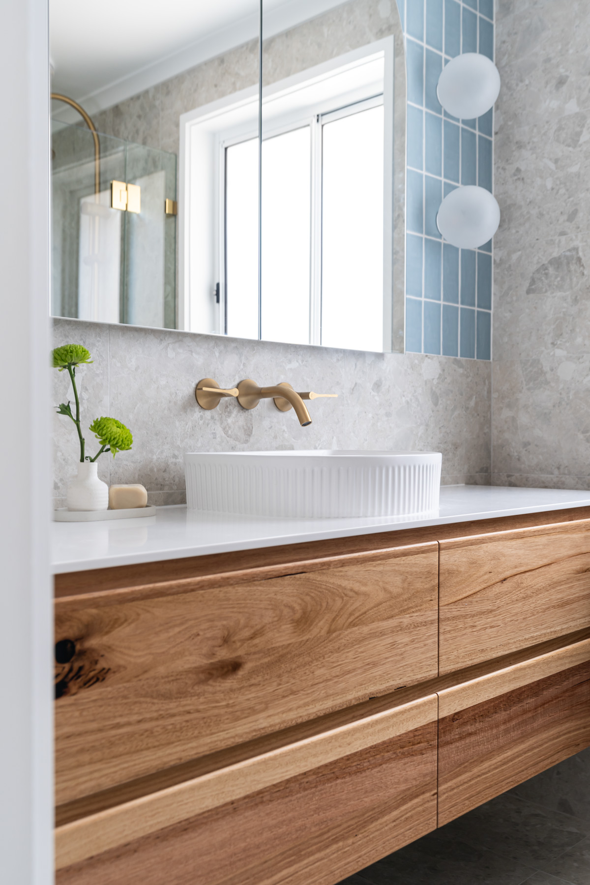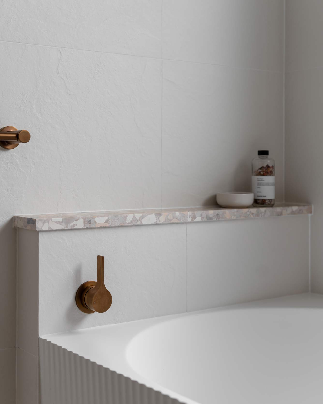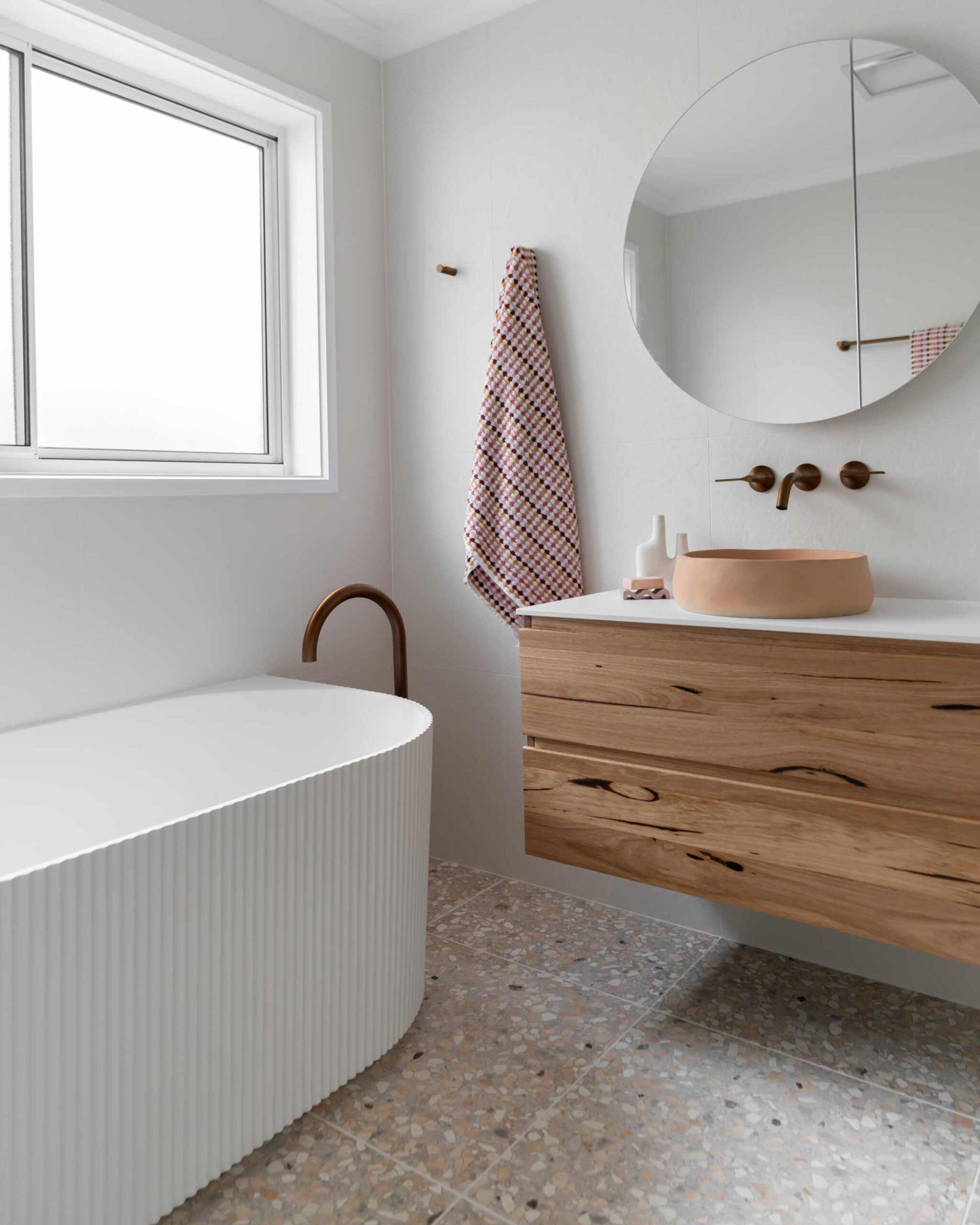The clients wanted a modern, playful, yet functional bathroom that would be both practical and welcoming for their grandkids and guests. Inspired by their love of pink and peach tones, they selected terrazzo flooring that adds a bold yet elegant touch. The tapware provides warmth and depth to the space and complements the soft hues of the tiles and timber vanity. A fluted bath and floor-standing bath spout serve as standout features, introducing a sense of luxury without overwhelming the room.