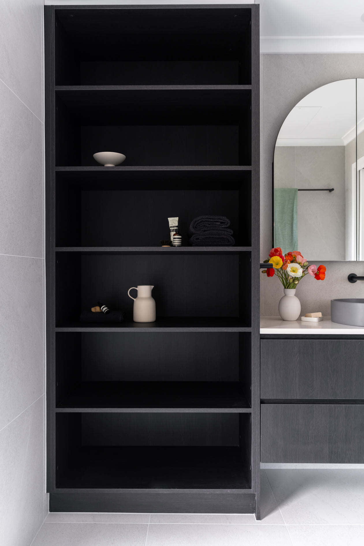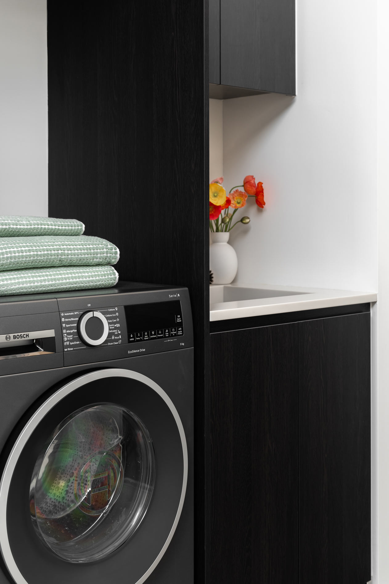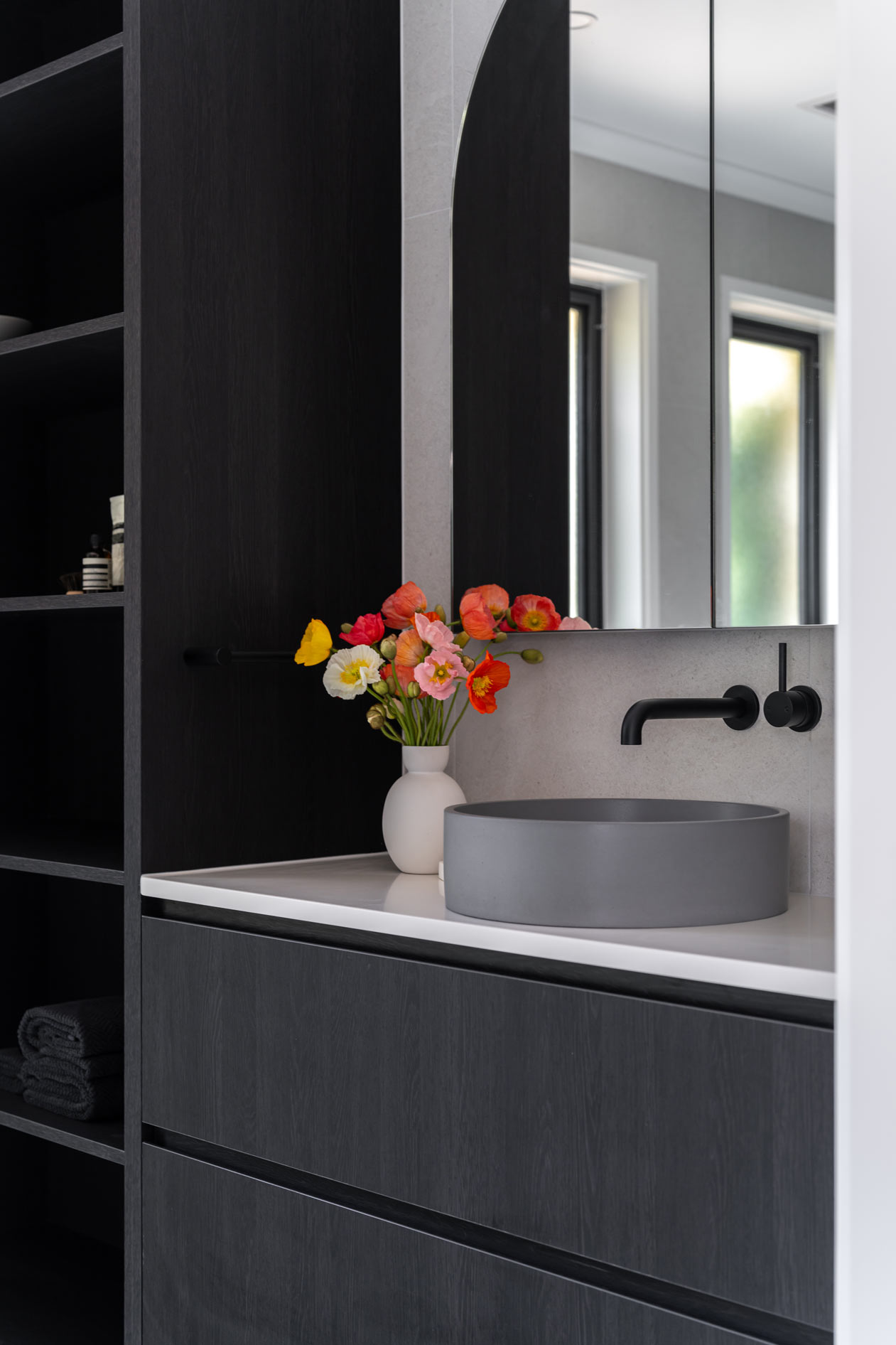 Custom Corian benchtops were used across the bathrooms and laundry for their seamless, durable finish. The joinery throughout was designed in Polytec Black Wenge Venette, adding a sleek, textural depth to every space.