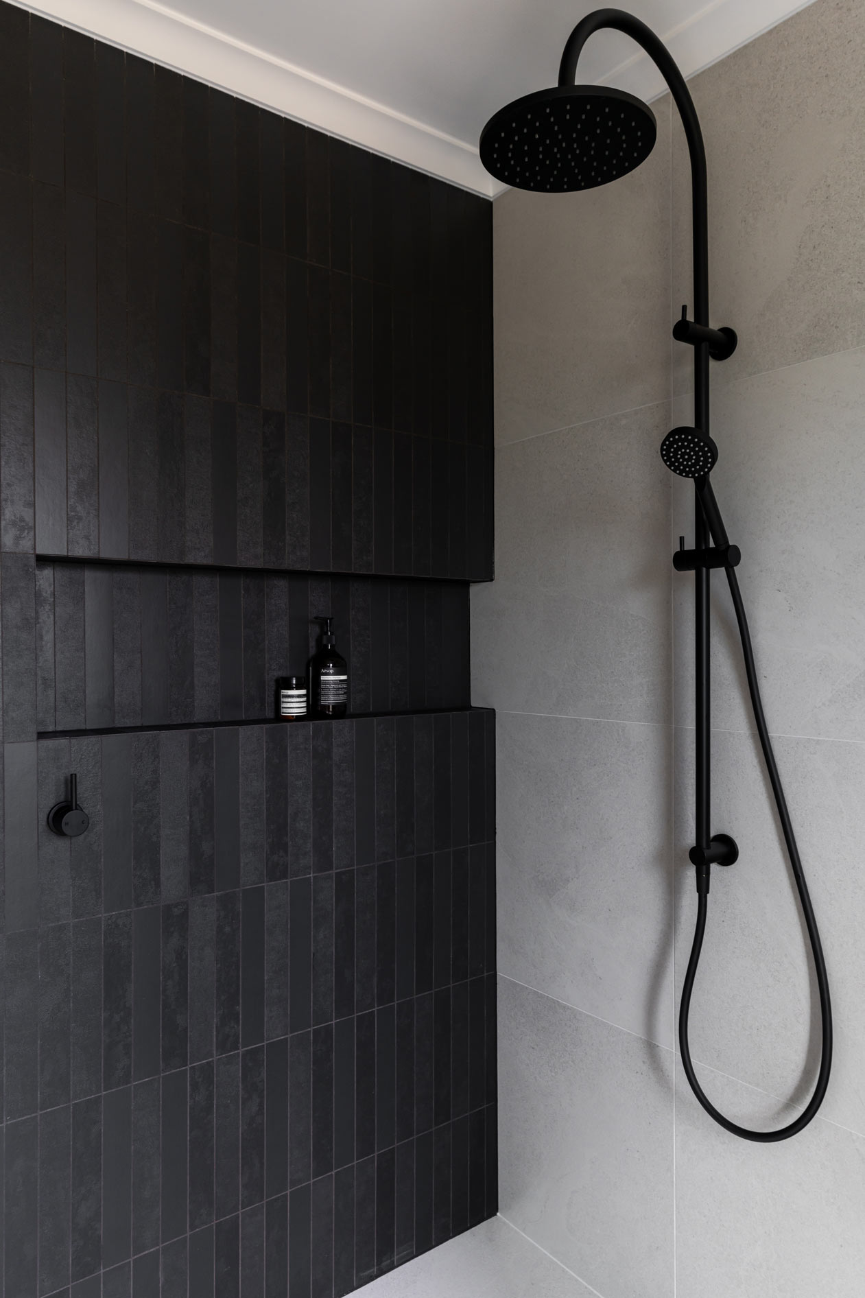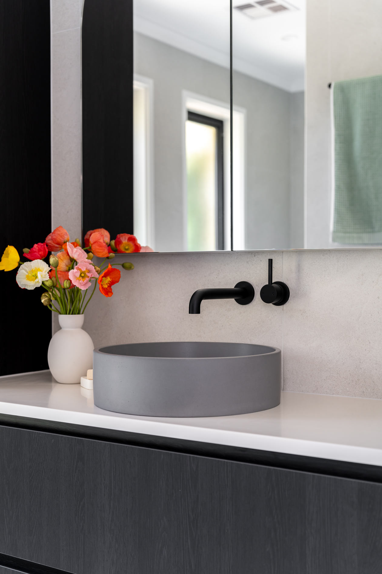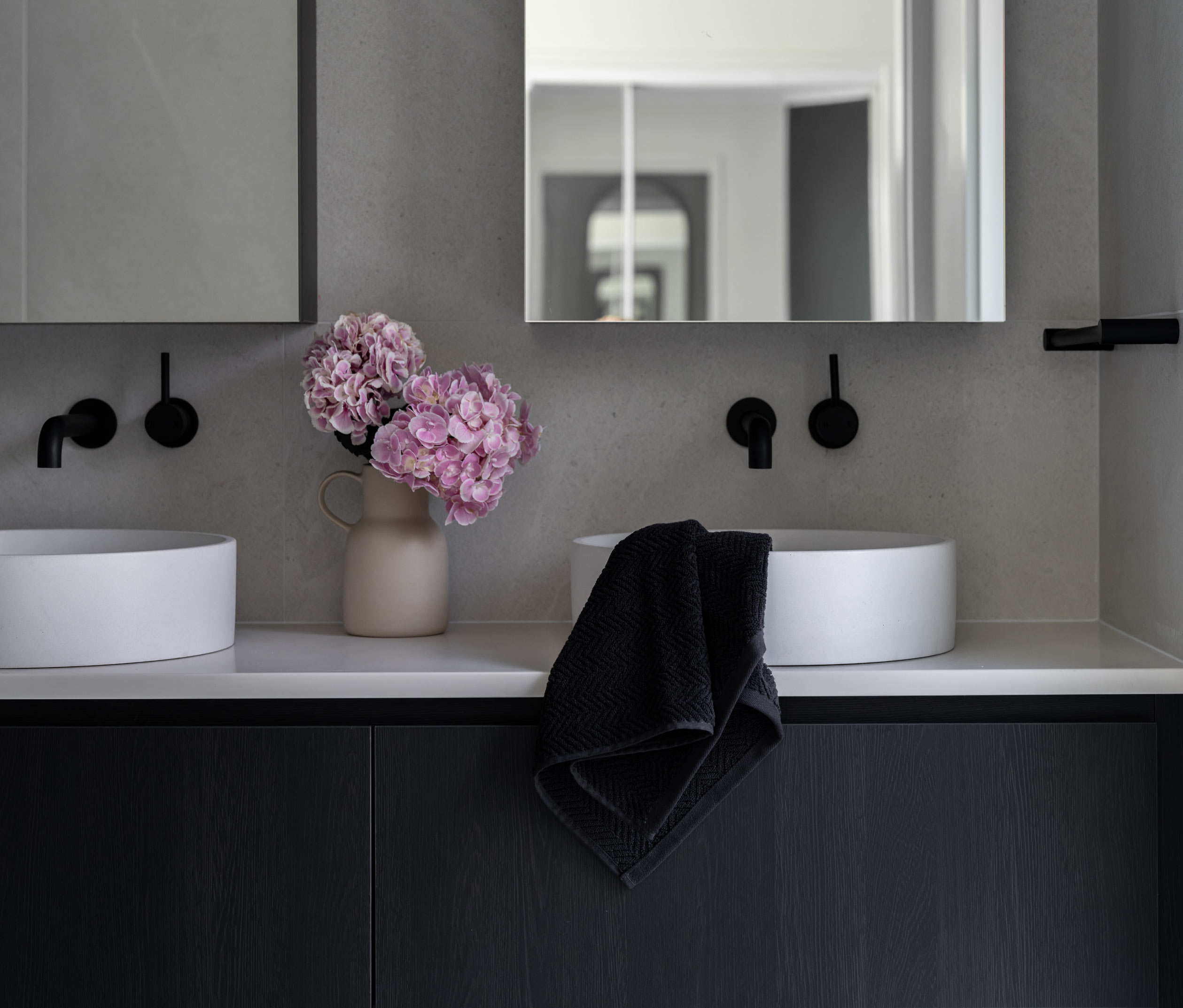 Each bathroom features concrete basins in soft, neutral tones paired with dramatic Jet Black Japanese tiles, which were used as feature walls to create contrast and texture. The result is a bathroom design that feels bold yet balanced.