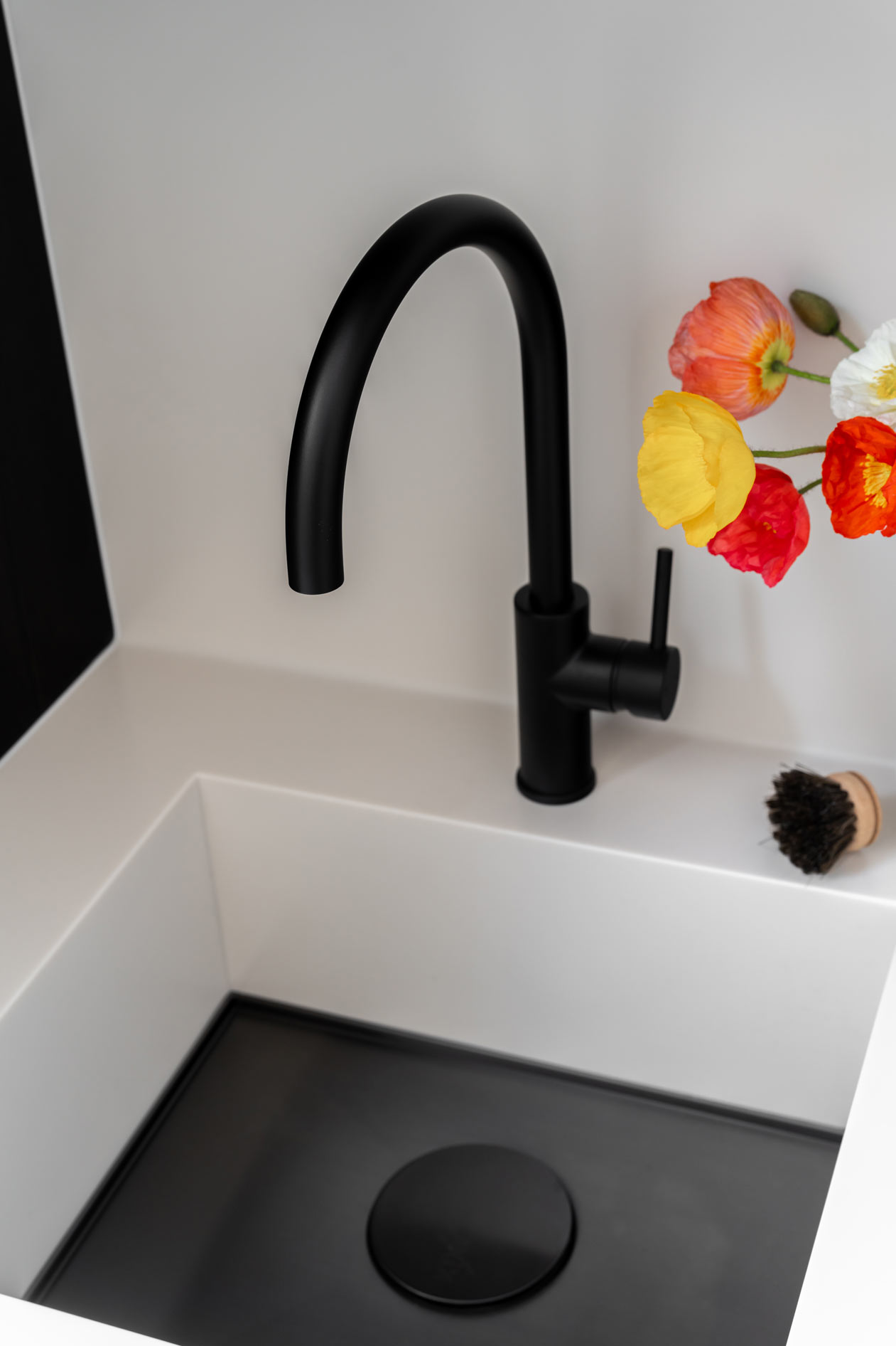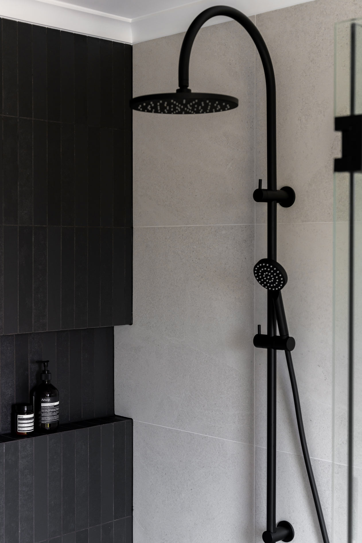 All bathrooms feature Faucet Strommen tapware in a matte black finish – a locally made, high-quality selection that pairs perfectly with the project’s moody palette.