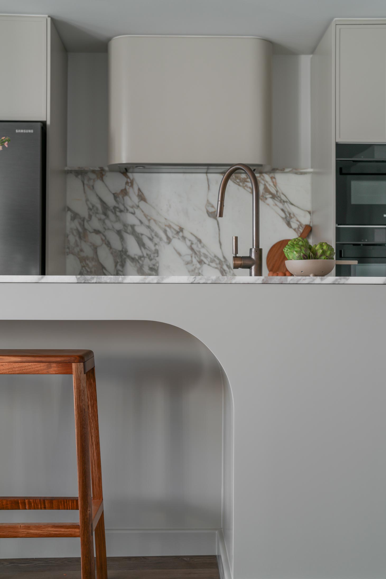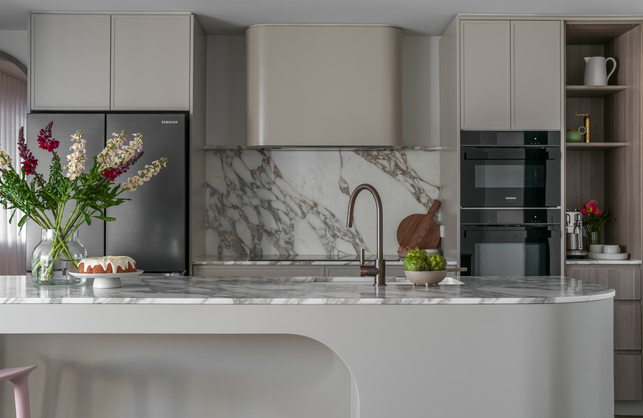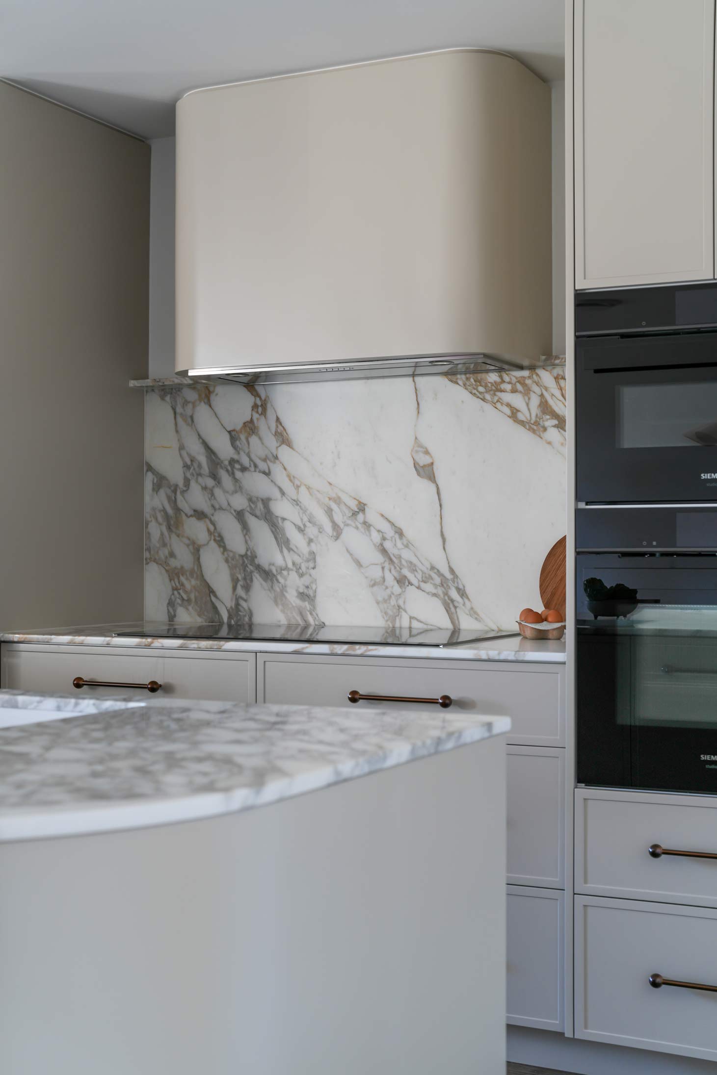 A key feature of this renovation is the one-piece, curved kitchen island, which is crafted from Calacatta Vagli Oro marble. This stunning piece offers exceptional craftsmanship with a seamless finish that adds both elegance and functionality to the space.