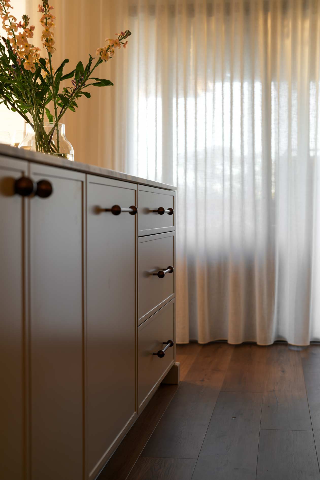 One of the major challenges in this renovation was integrating the one-piece, curved kitchen island. Ensuring there were no visible joins required the island to be constructed and delivered as a single unit, which involved significant planning and skilled joinery. A temporary wall was removed to allow the island to be brought in without compromising the design’s seamless finish.