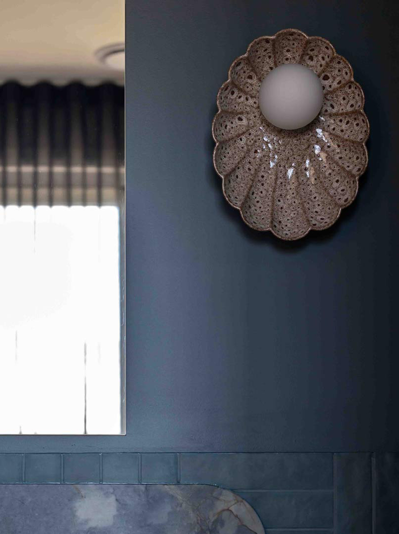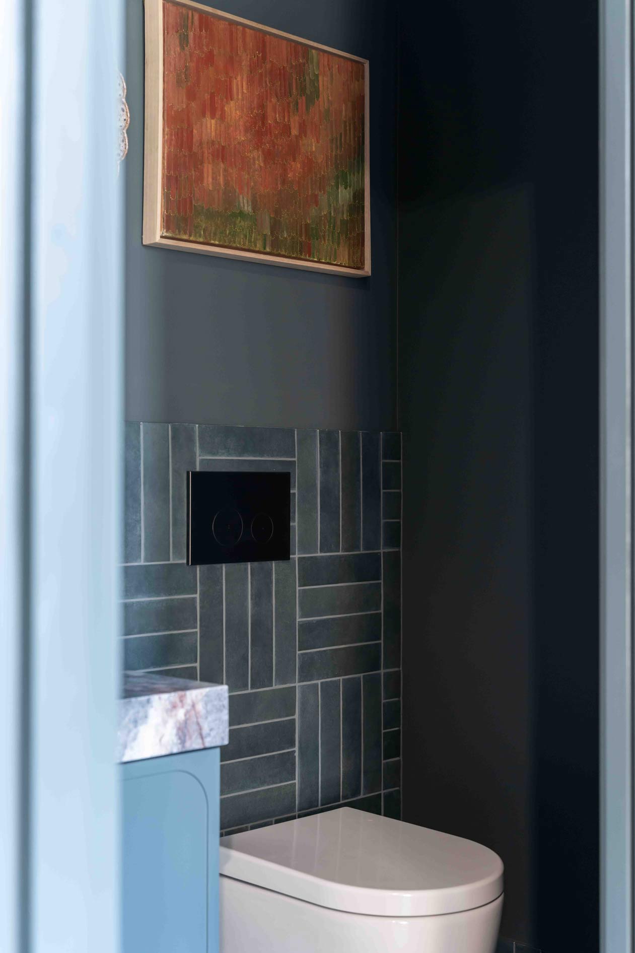 The colour-drenched powder room with its bold design contrasts beautifully with the neutral tones throughout the home, offering a striking visual focal point. The use of natural materials like Mirage Lake quartzite, vegan upholstery, and basket-weave tiles brings depth and character, tying the design elements together in a cohesive and sophisticated manner.