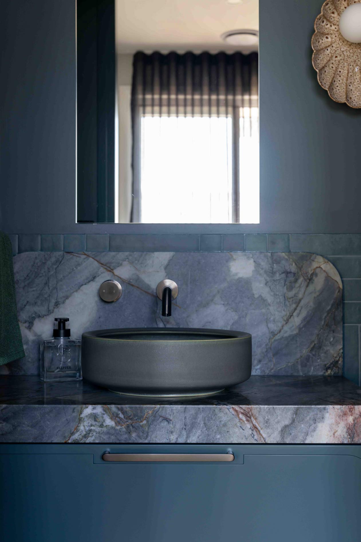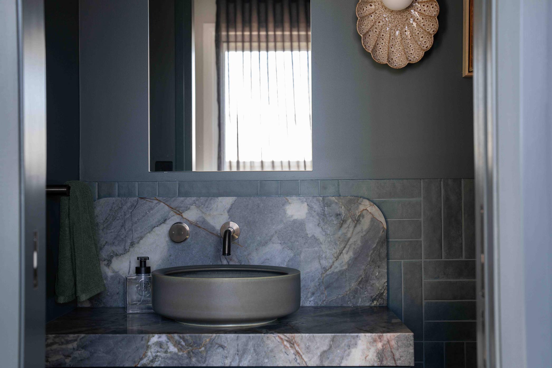 A key standout feature in this project is the powder room, which became a statement piece with its bold, colour-drenched design, paired with intricate basket-weave tiles. The powder room’s large apron and splashback in Mirage Lake quartzite further elevate the space, adding a sophisticated, luxurious touch to the renovation.
