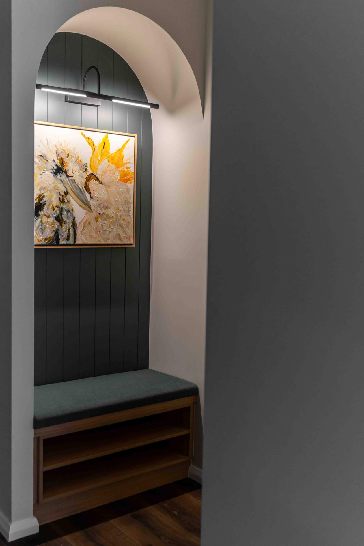 The custom joinery in the study, TV unit, and entry unit is also a defining feature, particularly the arches that were designed with precision and attention to detail.