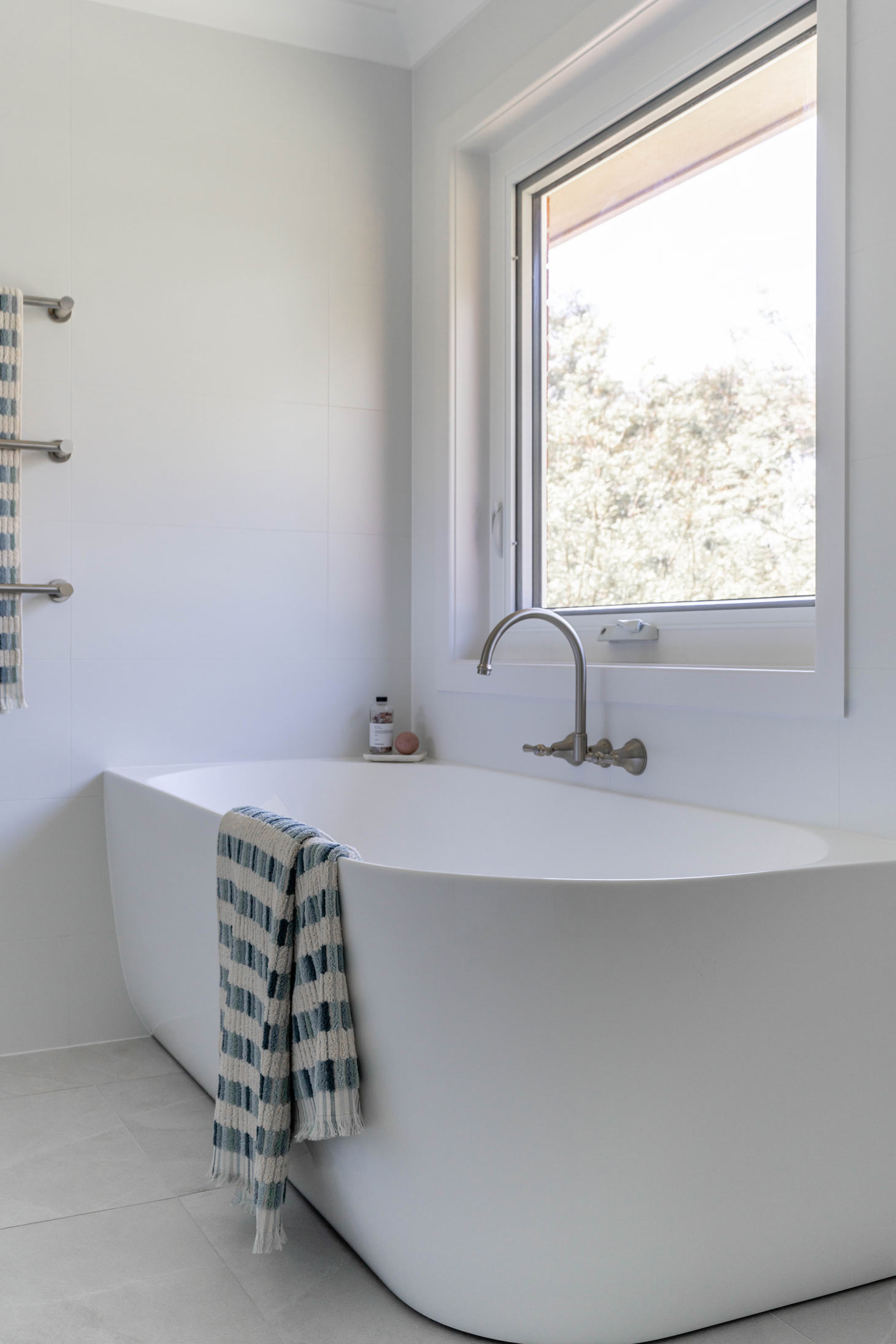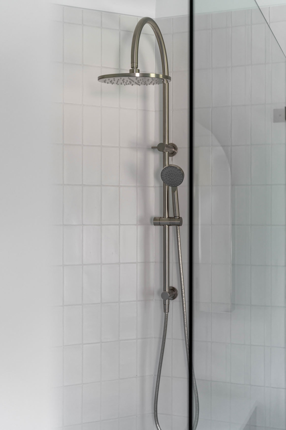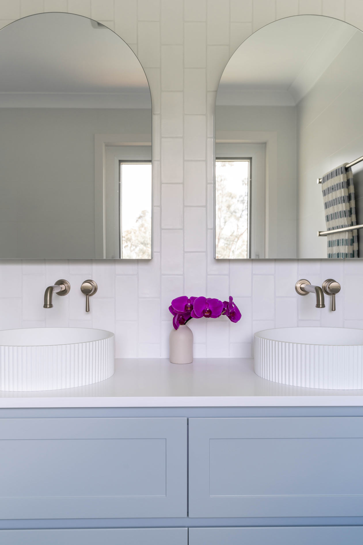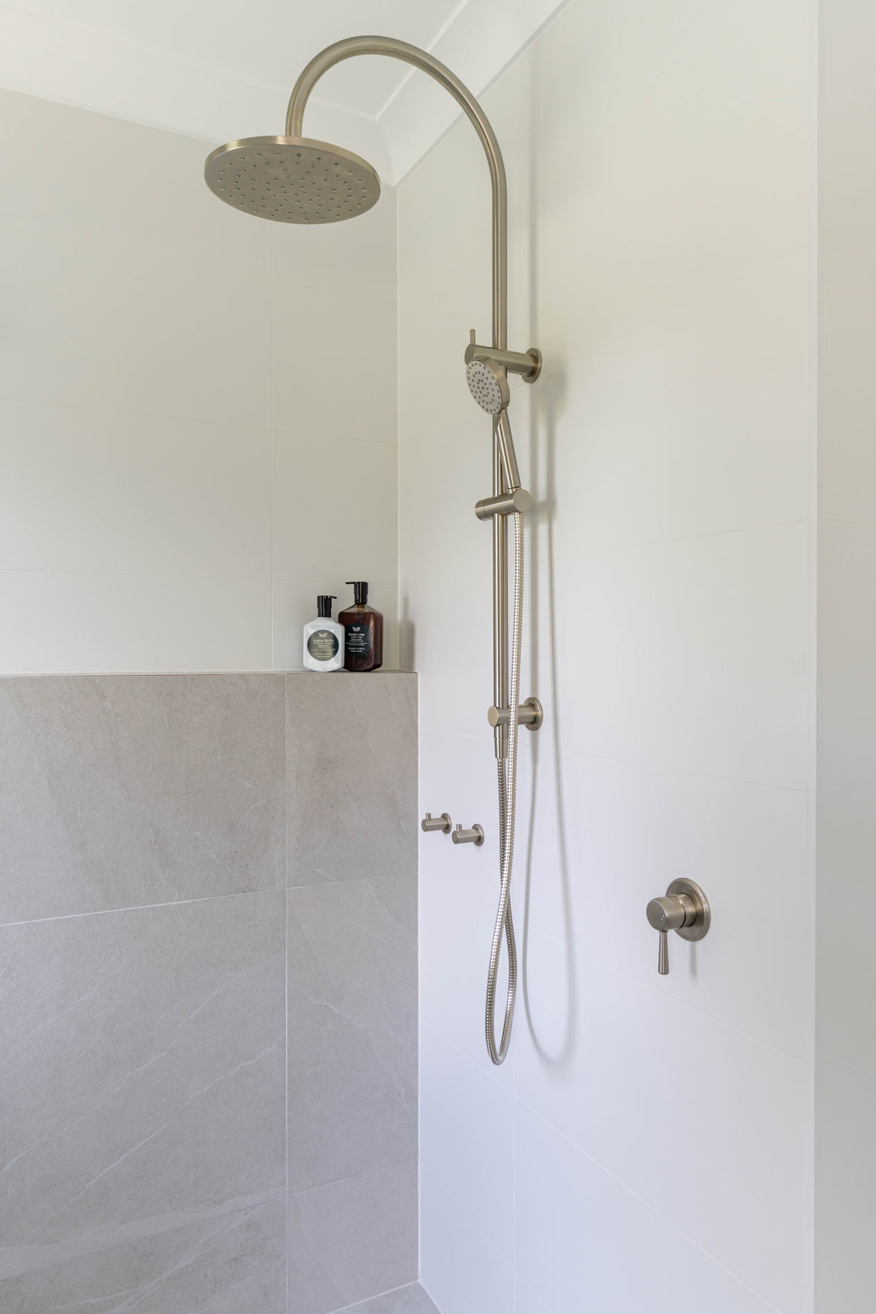 Throughout the bathrooms, the client selected brushed nickel tapware in a provincial style from Faucet Strommen – an Australian-made brand known for its quality and timeless aesthetic.