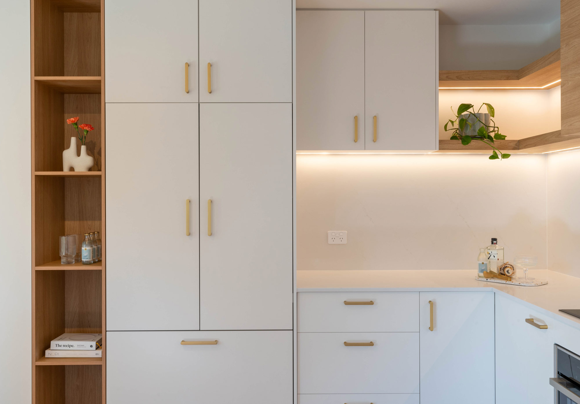 One of the design challenges was integrating custom strip lighting into the floating kitchen shelves. The lighting needed to run the full length of the shelves without interrupting the clean lines or timber finish. With careful planning and collaboration between our joiner and electrician, we were able to achieve a clean, seamless result that enhances the mood and functionality of the space.