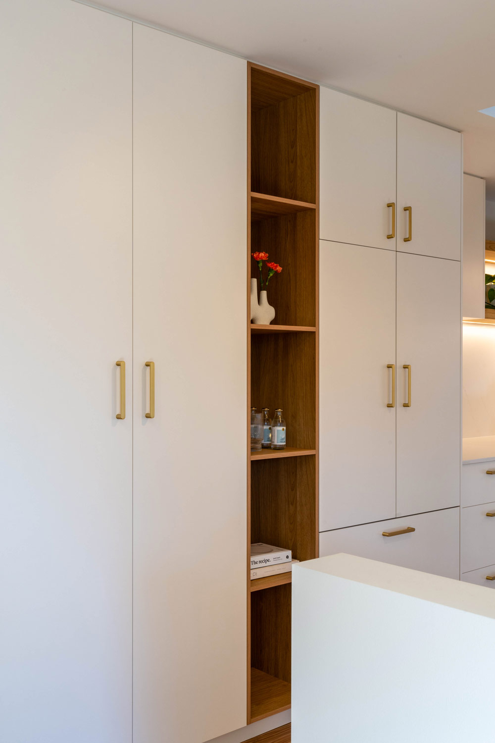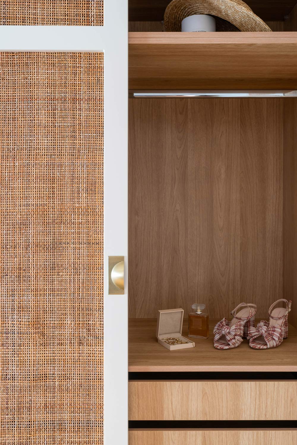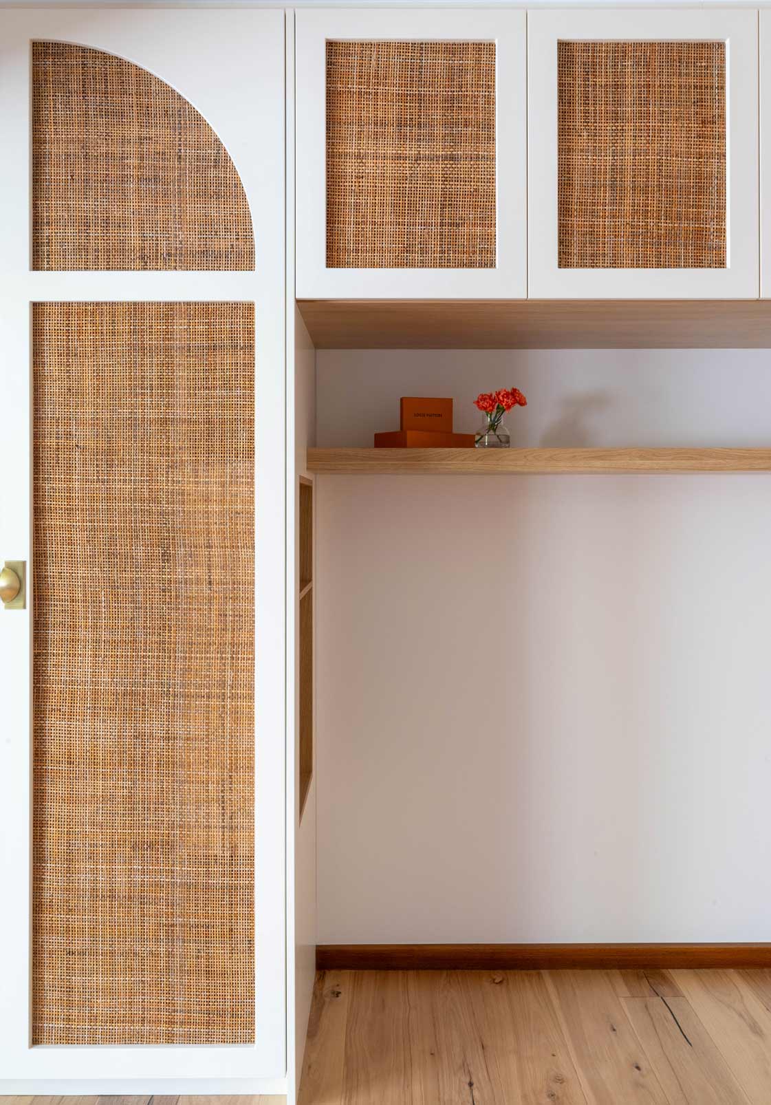 Custom joinery in the bedrooms features rattan insets, adding a subtle texture and tying in with the relaxed, organic palette. Throughout the home, warm oak elements and layered lighting work together to create a cohesive and calming atmosphere.