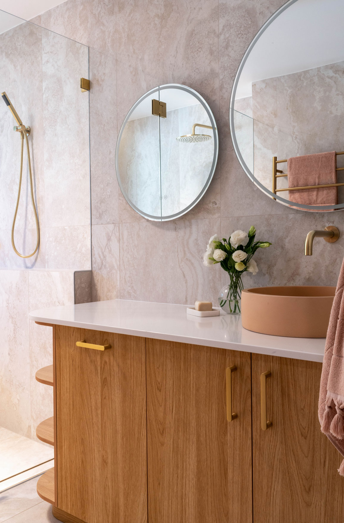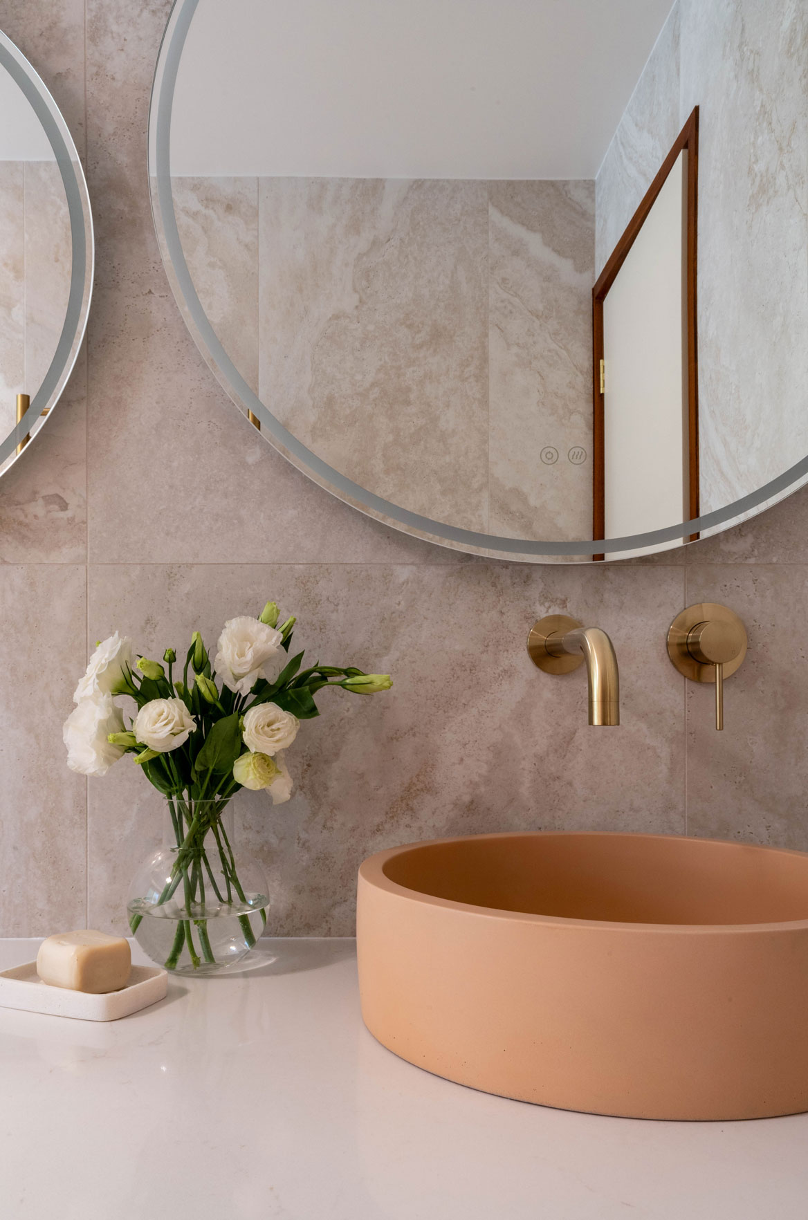 They had a few key requests, all lighting needed to be warm, their timber dining table had to stay, and they preferred not to use stainless steel sinks or tubs. These choices naturally pointed toward a soft, organic material palette with warm undertones and subtle texture.