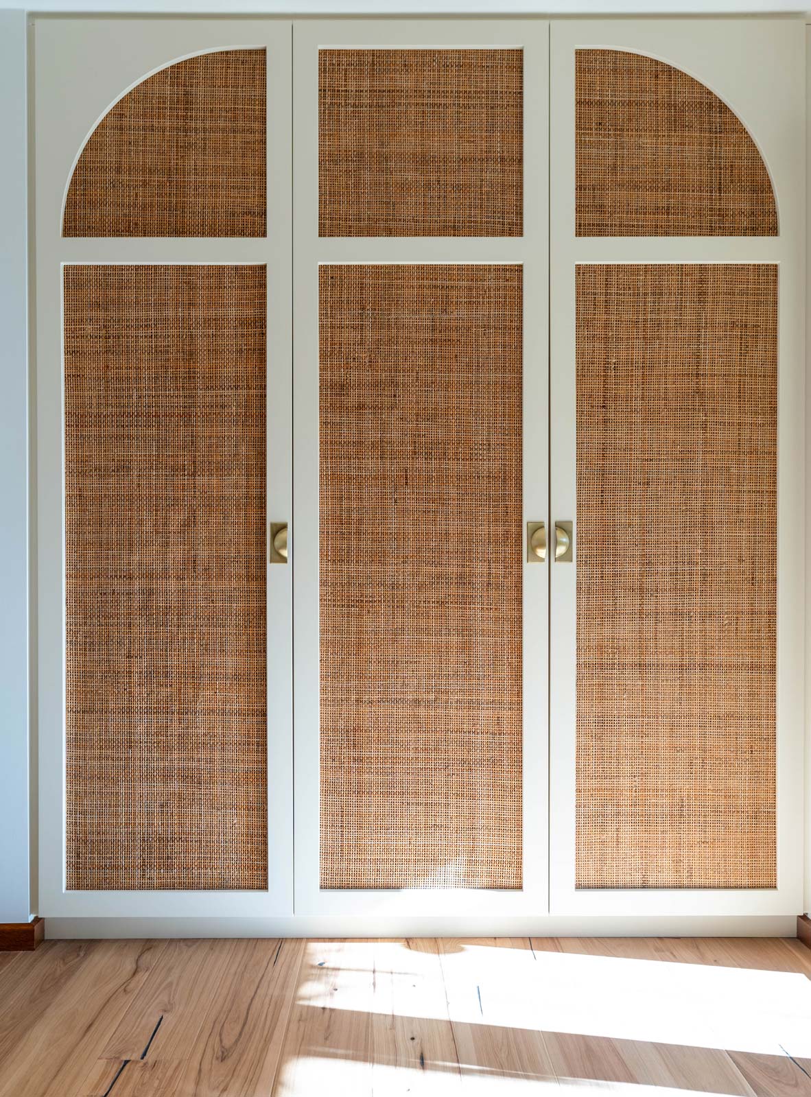 The final design brings together elements of Scandinavian simplicity and bohemian warmth. Light finishes and natural textures were used to keep the space feeling open and serene. Timber floating shelves, rattan insets in the custom robes, and warm oak accents layered across the home all contribute to a feeling of laid-back sophistication.