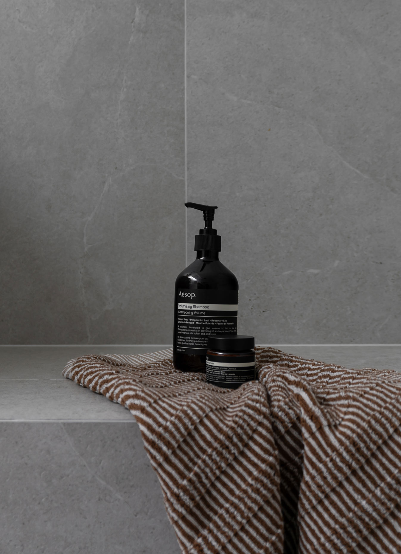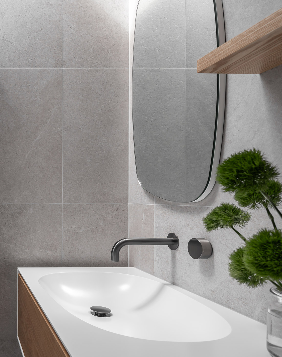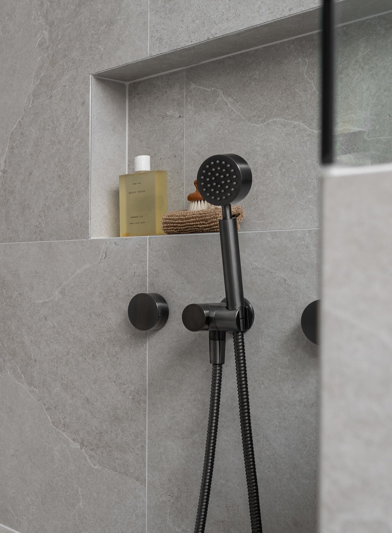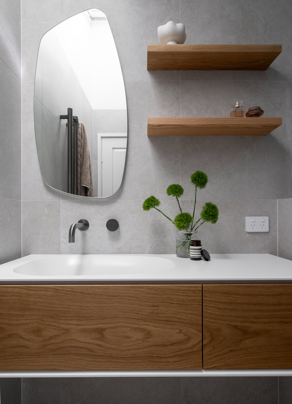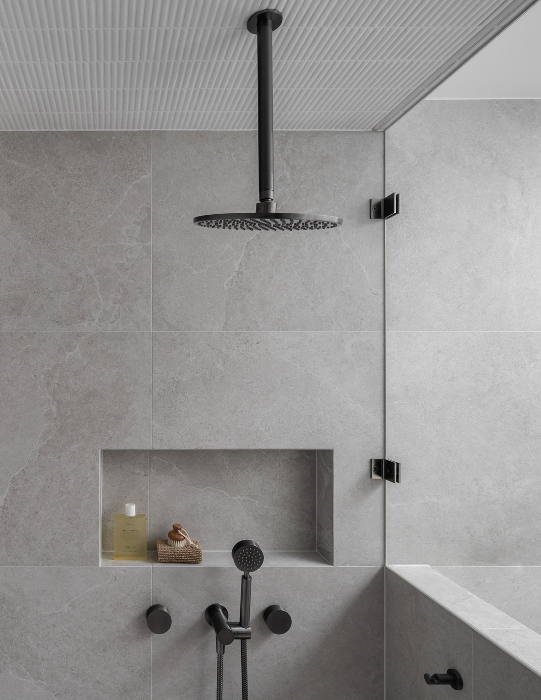 The design features a calming colour palette of whites and light greys, contributing to a serene and luxurious ambiance. The handcrafted Zuster vanity, solid timber floating shelves, and mirror bring timeless elegance to the space, while the brushed gunmetal Sussex tapware offers a timeless, modern, refined touch.