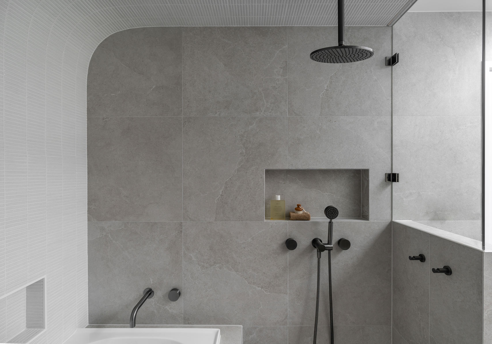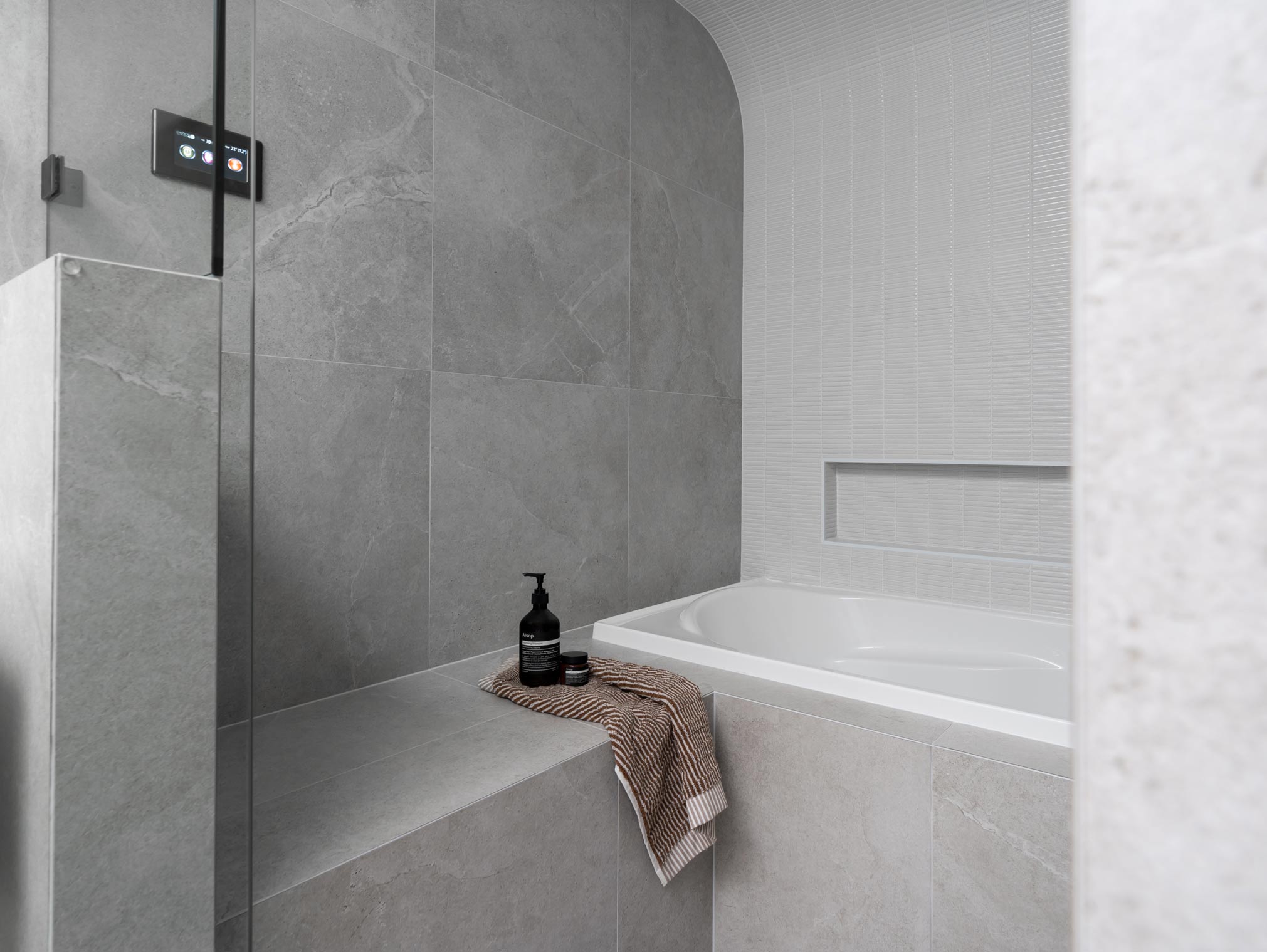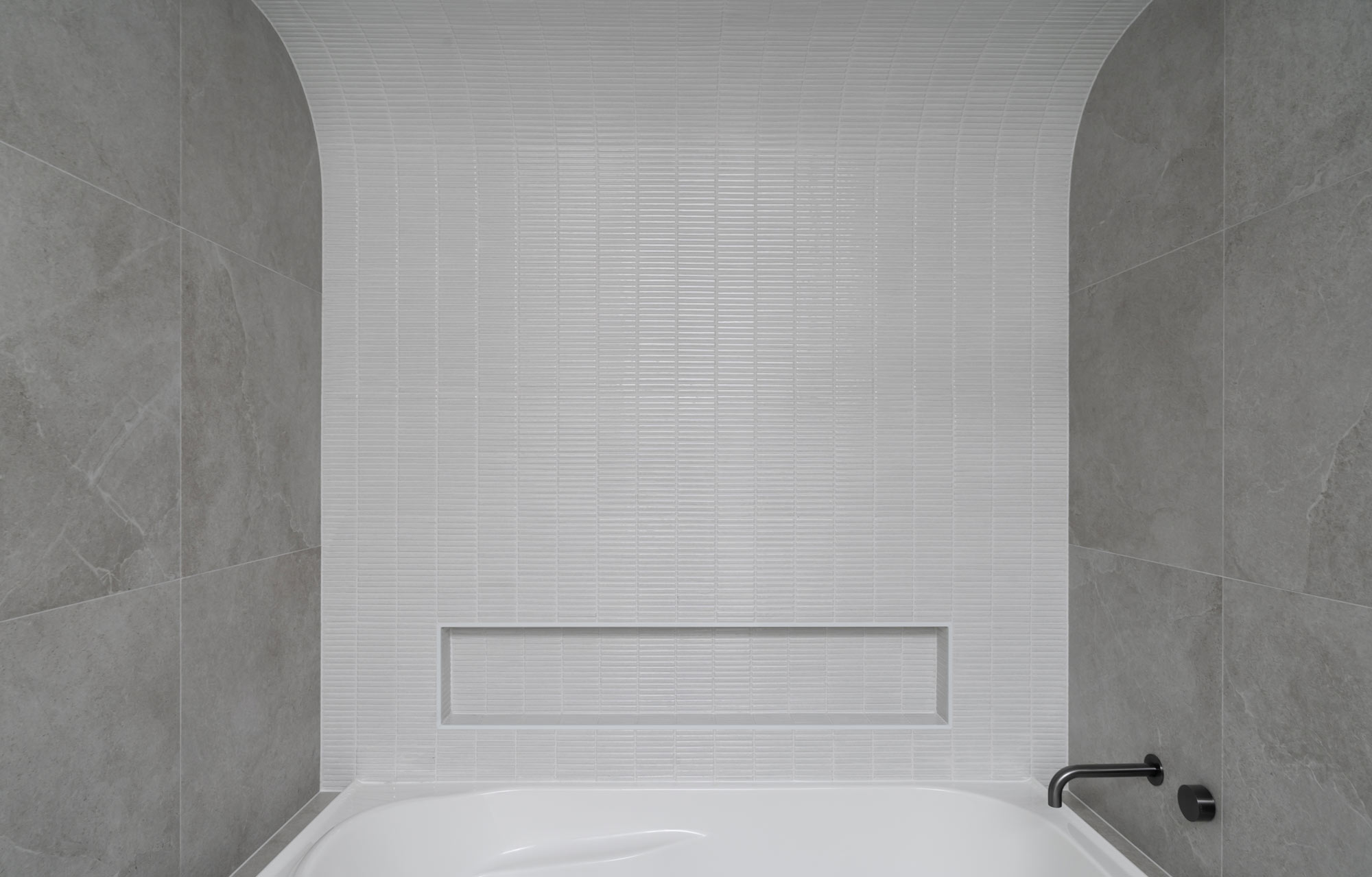 This renovation incorporates several standout features, such as the seamless integration of a steam shower and spa bath, both of which elevate the space’s luxury feel. The curved ceiling was custom-designed to direct the flow of steam in the shower, while high-quality tiling and a strip light in the ceiling provide both functionality and visual interest.